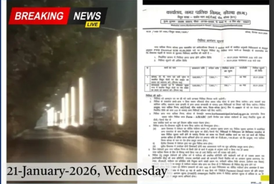 рдирдЧрд░ рдирд┐рдЧрдо рдХреА рдирд┐рд╡рд┐рджрд╛ рд╕реВрдЪрдирд╛ рдХреЗ рдЕрдиреБрд╕рд╛рд░ LED рд░реЛрдк рд▓рд╛рдЗрдЯ рдХрд╛рд░реНрдп рдХреА рдЕрдВрддрд┐рдо рддрд┐рдерд┐ 30 рдЬрдирд╡рд░реА 2026 рд╣реИ рдФрд░ рдЙрд╕реА рджрд┐рди рдЯреЗрдВрдбрд░ рдЦреЛрд▓рд╛ рдЬрд╛рдирд╛ рд╣реИред рдЗрд╕рдХреЗ рдмрд╛рд╡рдЬреВрдж рд╢рд╣рд░ рдХреЗ рдХрдИ рдЗрд▓рд╛рдХреЛрдВ рдореЗрдВ рдЯреЗрдВрдбрд░ рдЦреБрд▓рдиреЗ рд╕реЗ рдкрд╣рд▓реЗ рд╣реА LED рд░реЛрдк рд▓рд╛рдЗрдЯреЗрдВ рд▓рдЧреА рдФрд░ рдЪрд╛рд▓реВ рд╣рд╛рд▓рдд рдореЗрдВ рдирдЬрд░ рдЖ рд░рд╣реА рд╣реИрдВ, рдЬрд┐рд╕рд╕реЗ рд╡рд░реНрдХ рдСрд░реНрдбрд░ рд╕реЗ рдкрд╣рд▓реЗ рдХрд╛рд░реНрдп рд╢реБрд░реВ рд╣реЛрдиреЗ рдХрд╛ рдЖрд░реЛрдк рд▓рдЧрд╛ рд╣реИред