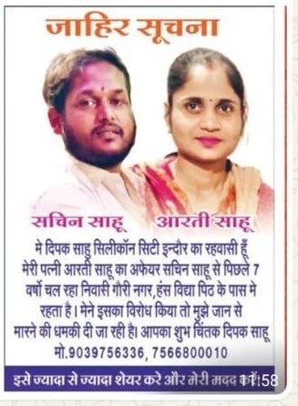 “मैं दीपक साहू, निवासी सिलिकॉन सिटी, इंदौर, यह स्पष्ट करना चाहता हूं कि मेरी पत्नी आरती साहू का अफेयर पिछले 7 वर्षों से सचिन साहू नामक व्यक्ति से चल रहा है, जो इंदौर के गौरी नगर, हंस विद्या पीठ के पास रहता है. जब मैंने इसका विरोध किया, तो मुझे जान से मारने की धमकियां दी जाने लगीं.”