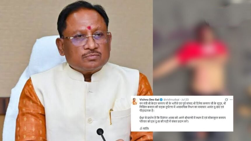 नया रायपुर के मंदिर हसौद थाना इलाके में दर्दनाक सड़क हादसा हुआ है, जिसमें मंत्री केदार कश्यप के भतीजे निखिल कश्यप की मौत हो गई। हादसे में एक अन्य युवक गंभीर रूप से घायल हो गया, जिसका इलाज चल रहा है। वही निखिल कश्यप की मौत पर छत्तीसगढ़ के सीएम विष्णुदेव साय ने शोक जताया है।